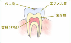 ミュータンス連鎖球菌をはじめとする細菌が出す酸によって、歯が溶かされて虫歯になります。細菌が口の中に多いとむし歯になりやすい状態です。